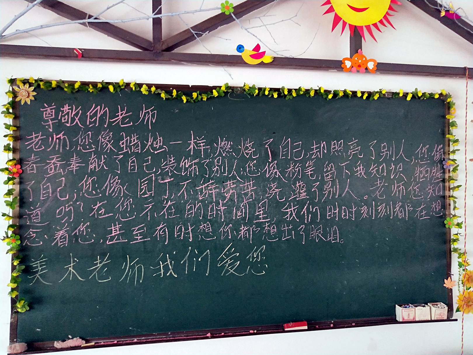 令我最为感动的一件事是在我休完产假回来后,我在宿舍收拾东西,她们就说:“老师老师,我们有事情要跟你说!”然后就被她们带去美术教室,快到教室时还把我眼睛蒙上了,说牵着我走。当我被她们搀扶走到教室门口时,我还记得听到旁边淅淅索索的声音“老师来了!老师来了!”最后当我睁开眼看到眼前的景象时,当场哇地就哭了。