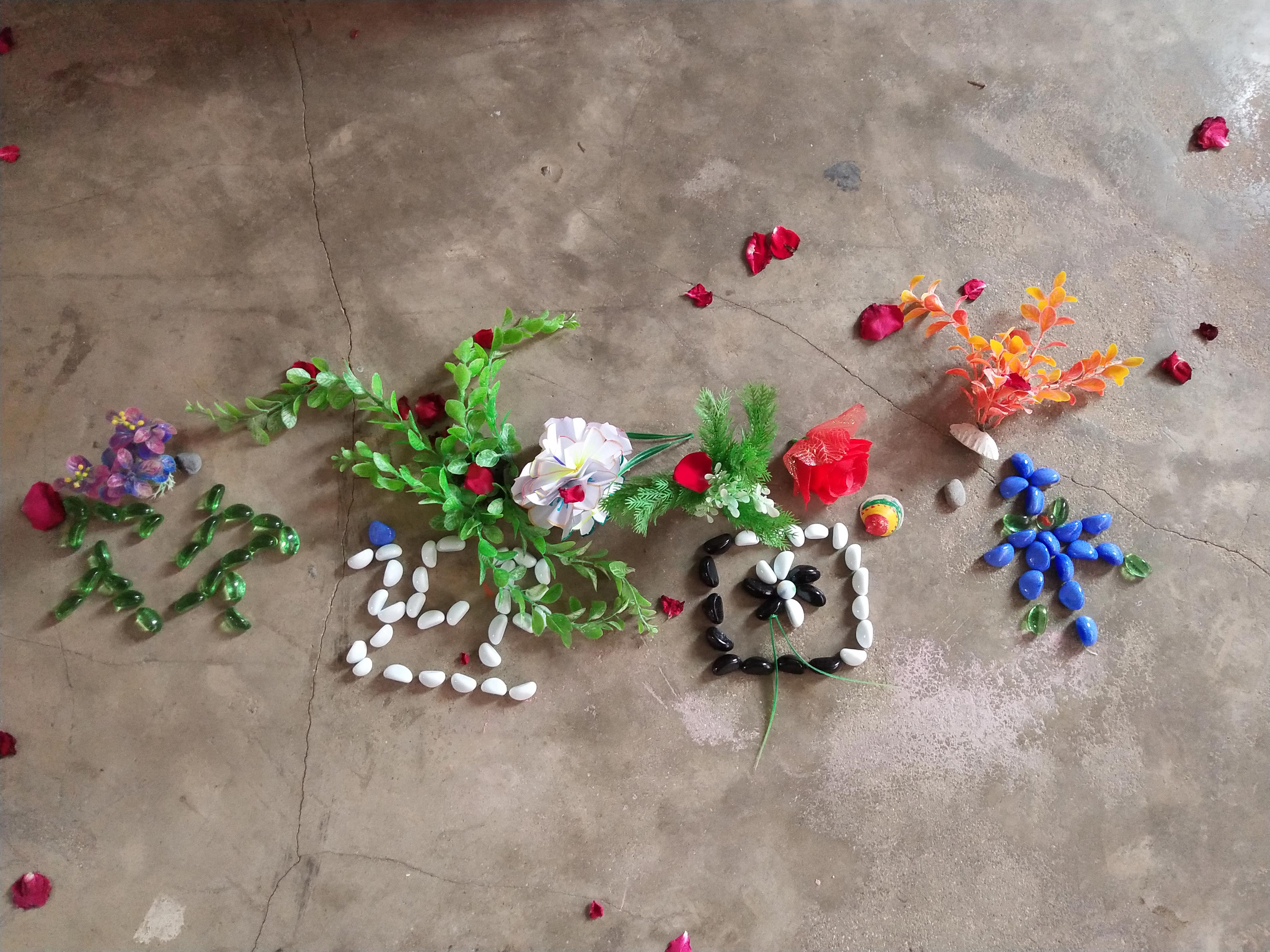 孩子们知道我喜欢花花草草,用花瓣从教室门口到我的讲桌铺了一条花道,刚才就是一路牵着我走这条花道。她们在我的讲桌旁还用野花和小石头摆出了“欢迎回来”的字样。当时让我感动到哭得稀里哗啦,孩子们也涌上来抱我哭着:“老师,欢迎回来,我们想您了!”