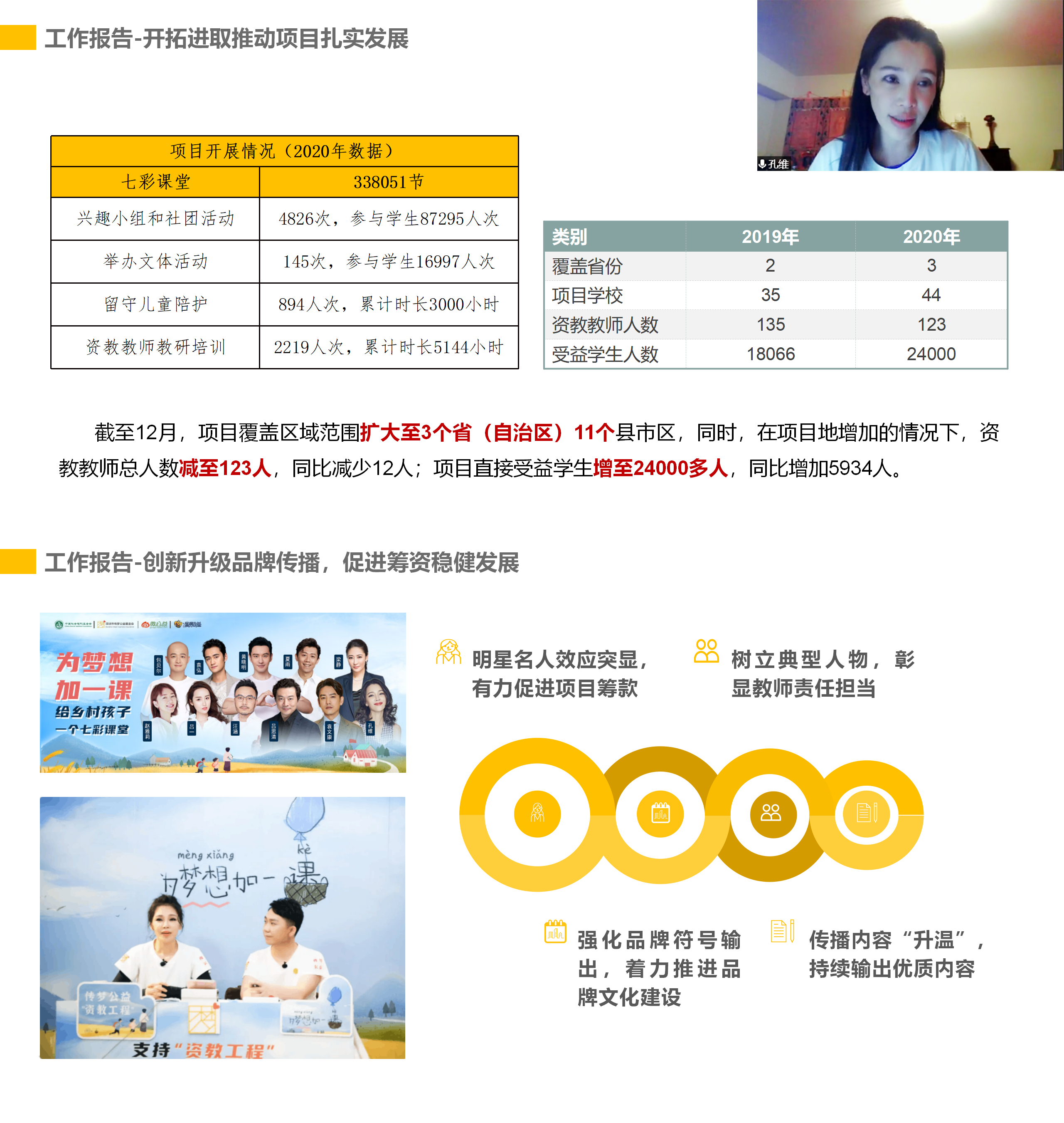 本次会议由我会执行秘书长陈默主持并解读审议议案,理事、秘书长孔维汇报了基金会2020年工作报告及2021年工作计划。感谢各理事在过去一年的支持和帮助,并回顾了受2020年外部环境变化和影响,基金会在项目专业化管理和内部治理,以及业务拓展方面做出的快速反应和突出成效,基金会在开源节流的基础上,实现了平稳运营,并大大提高了项目和品牌效益。同时,她也介绍了传梦公益2021年业务方向。