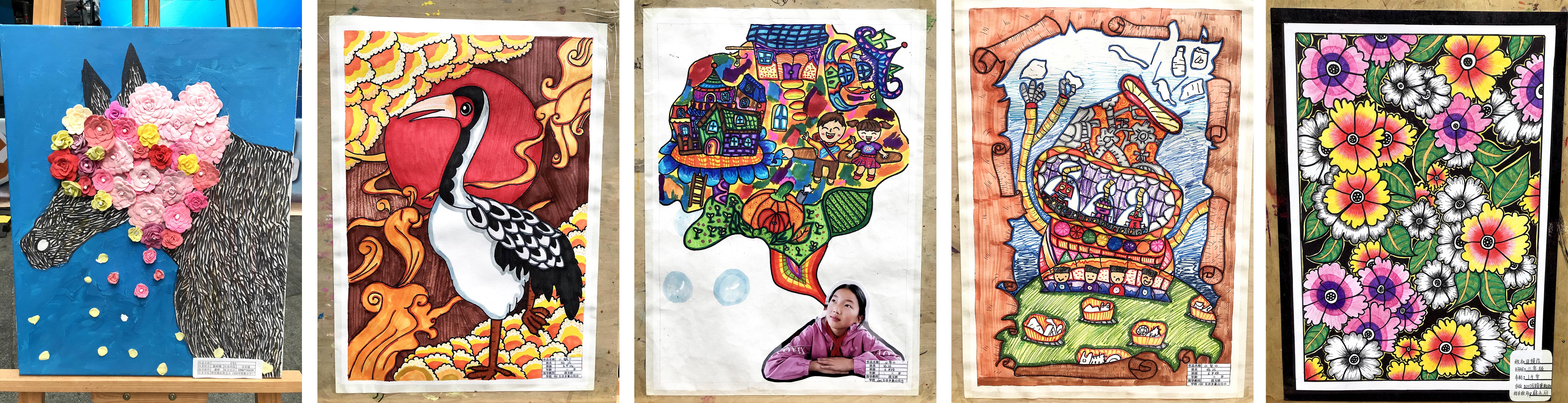 活动期间,现场展出88幅项目学生优秀美术作品,从幼儿园至六年级,从精美手工到线描色彩,从童年幻想到家国情怀,乡村孩子们的无限创意在七彩课堂中焕发出了无穷的魅力。