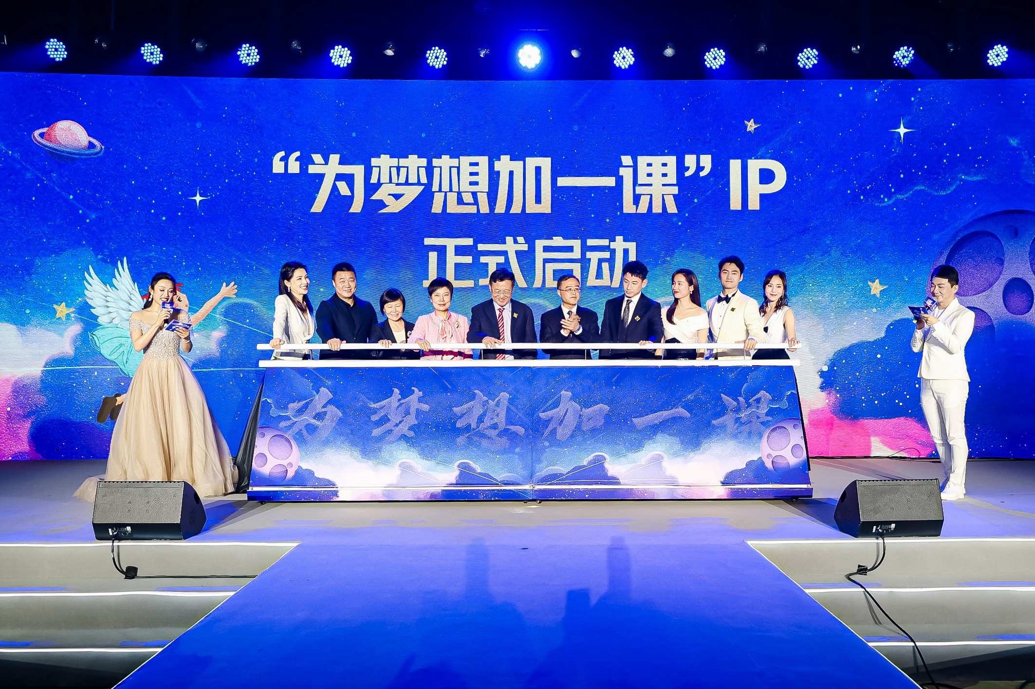 随后,贵州省原副省长、贵州人大常委会原副主任陈鸣明,贵州省政协原副主席、贵州省慈善总会会长陈敏,深圳市慈善会执行副会长房涛,中汇影视董事长孙莉莉,著名演员、传梦大使袁弘、吕一、钱泳辰、文予琪,传梦公益基金会理事徐俐俊,传梦公益创始人孔维一起上台,举行“为梦想加一课”品牌IP启动仪式。