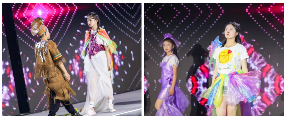 《奇幻的梦》时装走秀为云南、贵州、广西三个地区项目学校师生共同完成,孩子们利用塑料袋、报纸等废弃材料进行环保创意创作,拼接组合成一件件新奇趣味、具有民族特色的环保服装,秀出自信,展现了七彩课堂的美术成果。