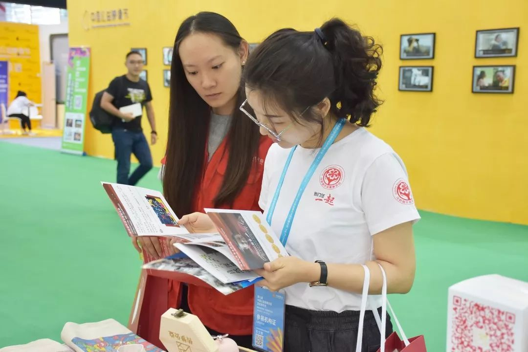 中国社会福利基金会秘书长缪瑞兰(左二)与募捐和品牌中心副主任郑璇(左一)参观传梦公益展位。