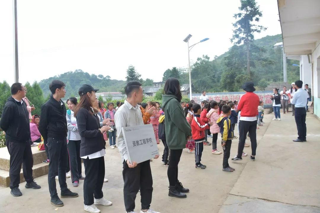 在岑兴伟校长发表感谢致辞后,刘莎莎女士和孔维女士一同为兰蛇坡教学点授牌,由资教教师进行挂牌,教师们与学生一起和下校团队合影留念。