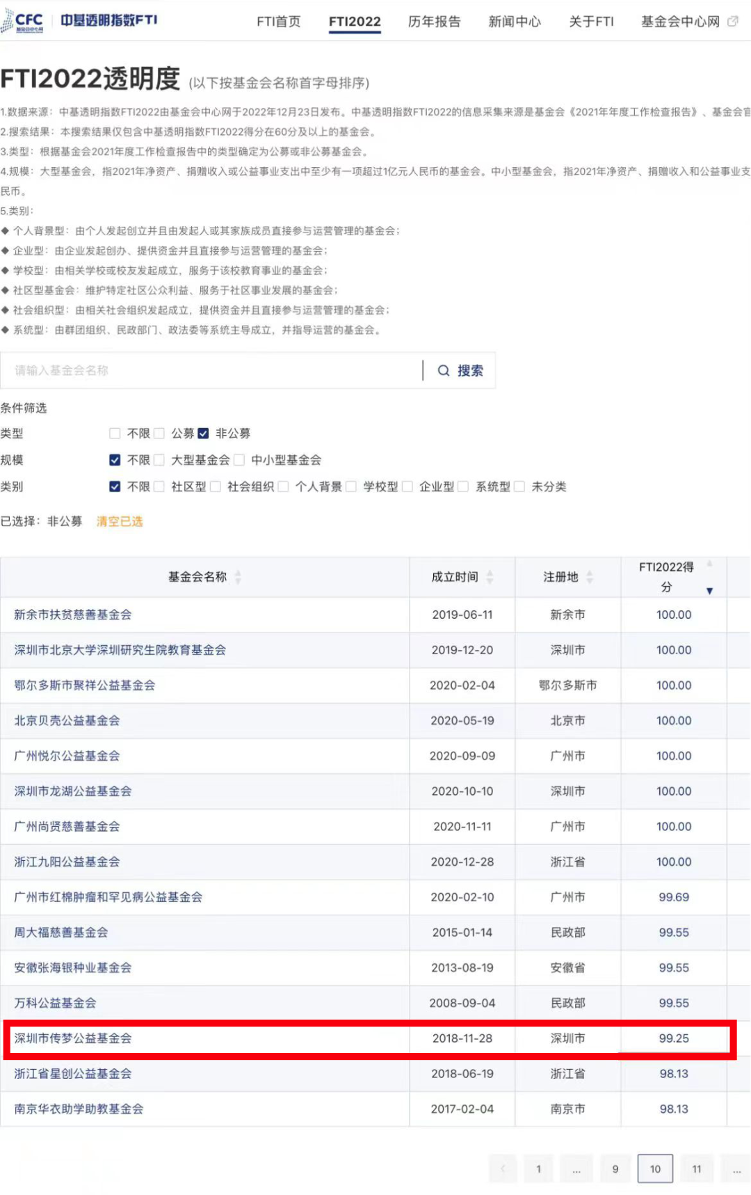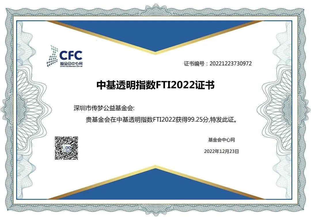 2022年12月23日,基金会中心网发布中基透明指数FTI2022透明度榜单,深圳市传梦公益基金会FTI2022获评99.25分。