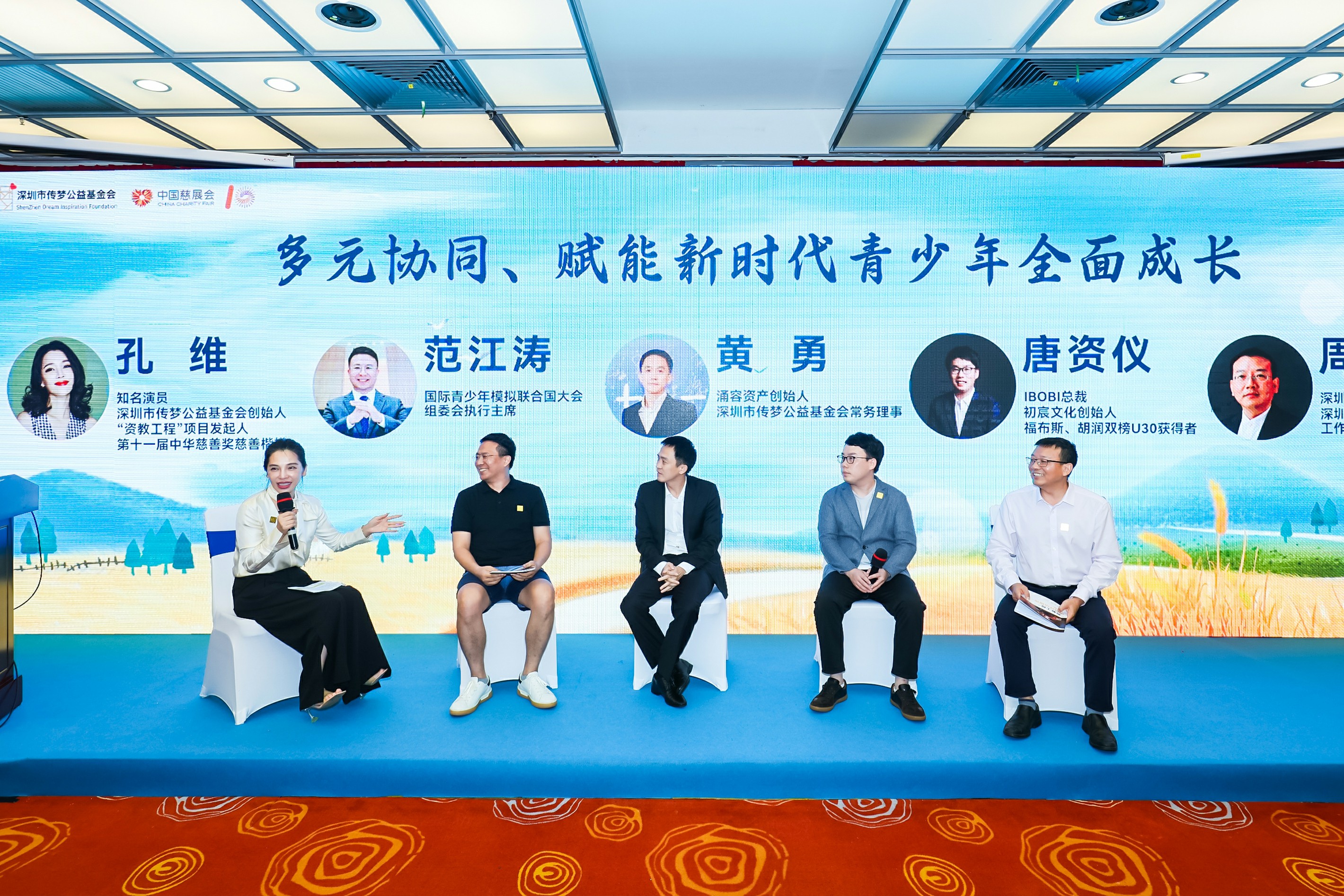 传梦公益创始人孔维,深圳市人大常委会社会建设工作委员会委员、深圳大学教授周林刚,涌容资产创始人、深圳市传梦公益基金会常务理事黄勇,IBOBI国际家庭亲子俱乐部总裁、初宸文化创始人唐资仪以及国际青少年模拟联合国大会组委会执行主席范江涛五位嘉宾围绕“多元协同,赋能新时代青少年全面成长”开展了跨界讨论,大家结合自身视角与成功案例,针对城乡素质教育异同发表了不同观点,探讨了在社会环境和人口结构变化背景之下,教育的变与不变,为观众带去了不同视角的启迪。
