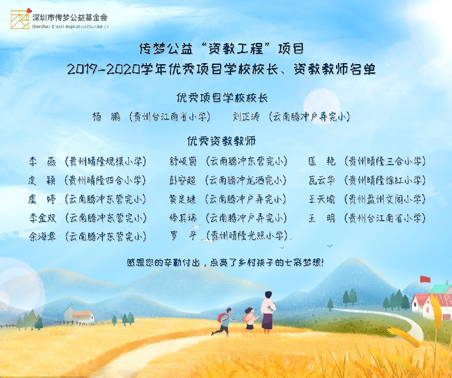 此次会议对“资教工程”项目2019-2020学年优秀项目学校校长及资教教师进行了线上表彰,授予杨鹏、刘正涛等人“优秀项目学校校长”荣誉称号,授予李燕等14位“优秀资教教师”荣誉称号,表彰他们对乡村教育事业、对“资教工程”作出的积极贡献。
