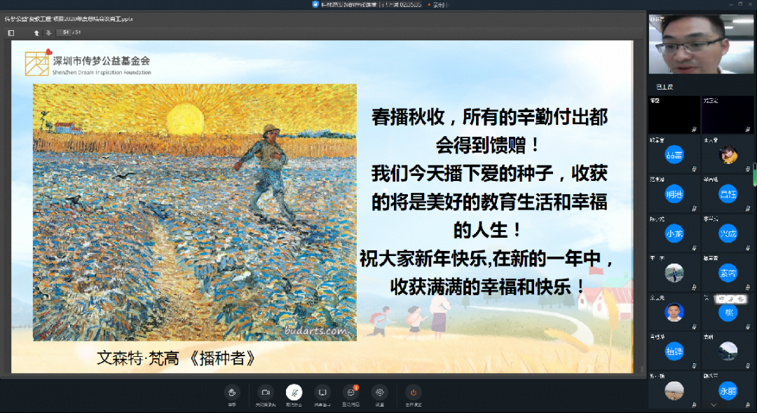 项目管理部项目主管肖植铧带领大家一同回顾盘点了2020年项目的各项主要工作,对项目学校及资教教师的努力付出表示感谢,并对2021年项目的主要发展方向及工作计划进行了说明及部署。最后以梵高的经典画作《播种者》鼓励资教教师们再接再厉,“播下爱的种子,收获的将是美好的教育生活和幸福的人生!”