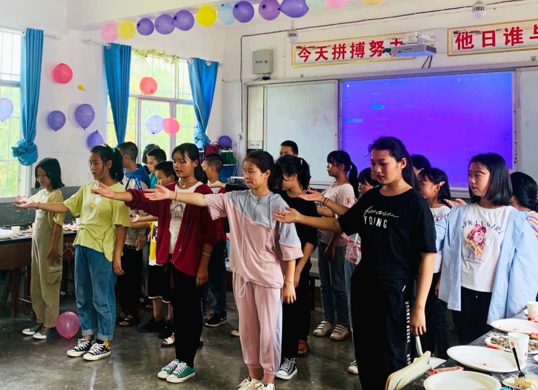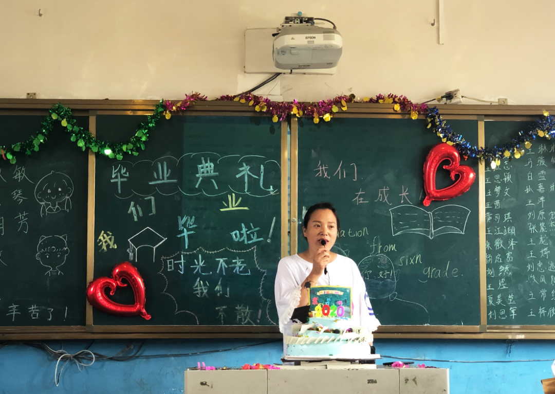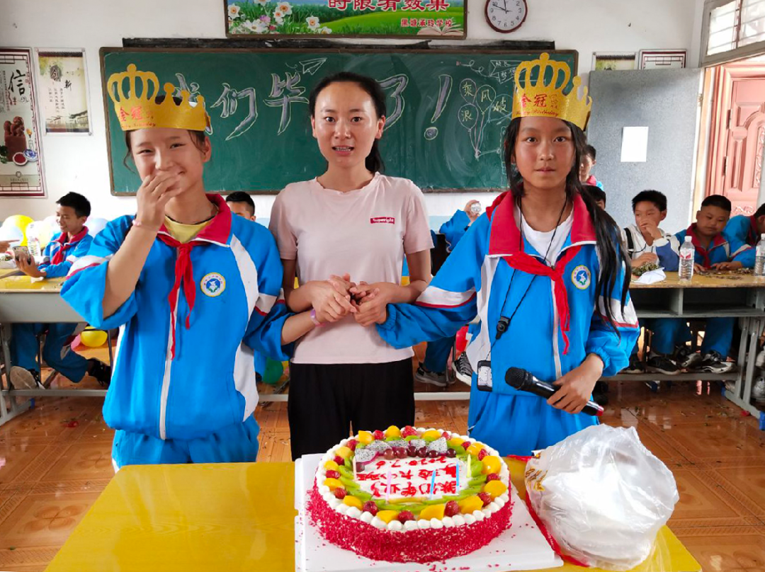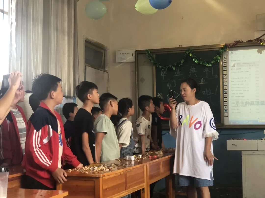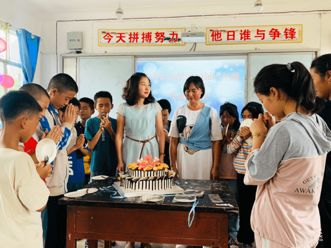 在上学期,资教教师组织收集了孩子们的愿望卡,发现大部分孩子都写了“希望毕业的时候有一次毕业晚会,还希望能有蛋糕……”在农村,孩子们基本上没什么机会能吃到蛋糕,举办晚会也有些许困难,但东方红小学的四位资教教师还是给毕业班的孩子们精心策划了一场毕业欢送会。