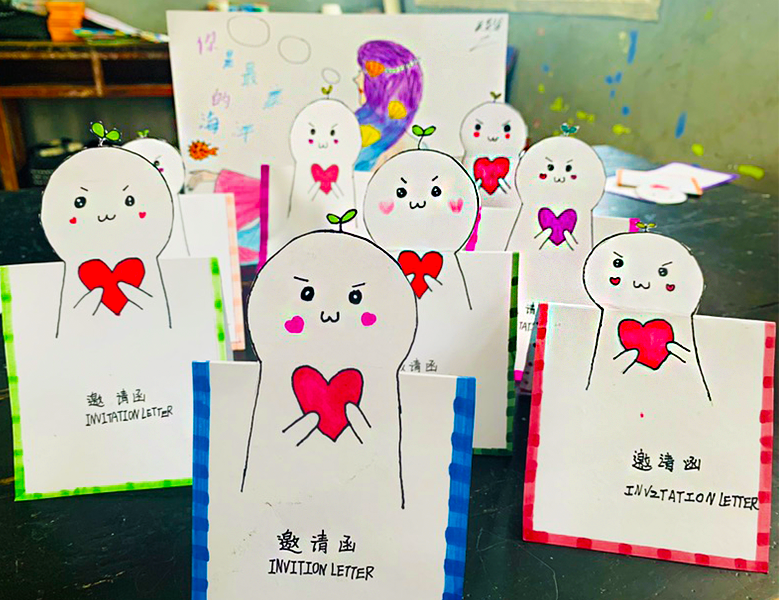 而孩子们也做了件让老师们惊喜的事,用在七彩课堂上学习到的英语、美术等知识,悄悄给每个老师都制作了一份精美的邀请函。