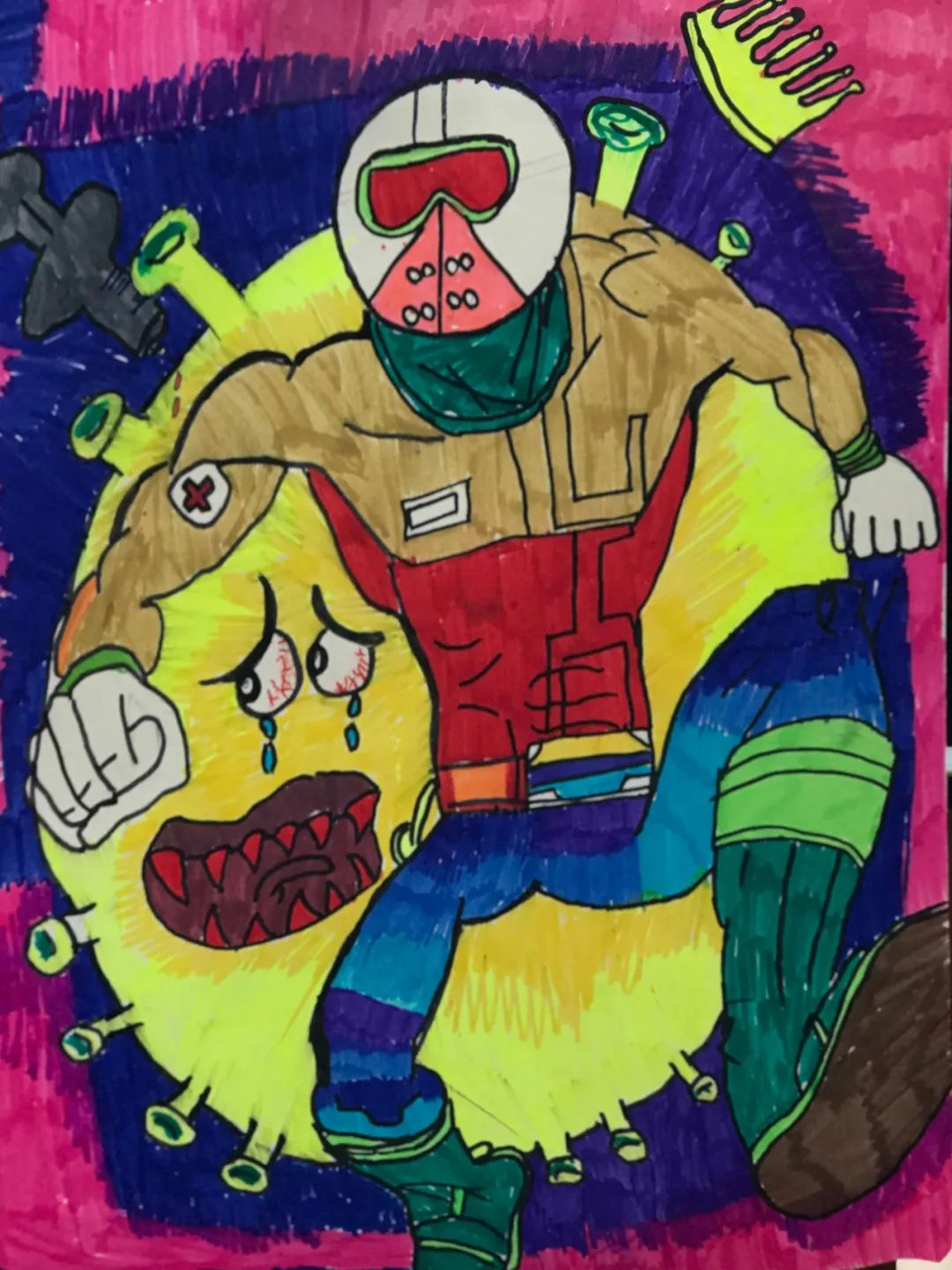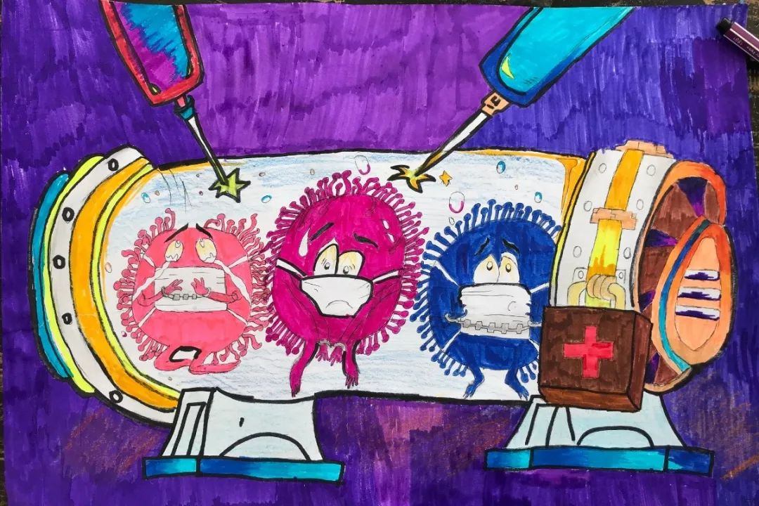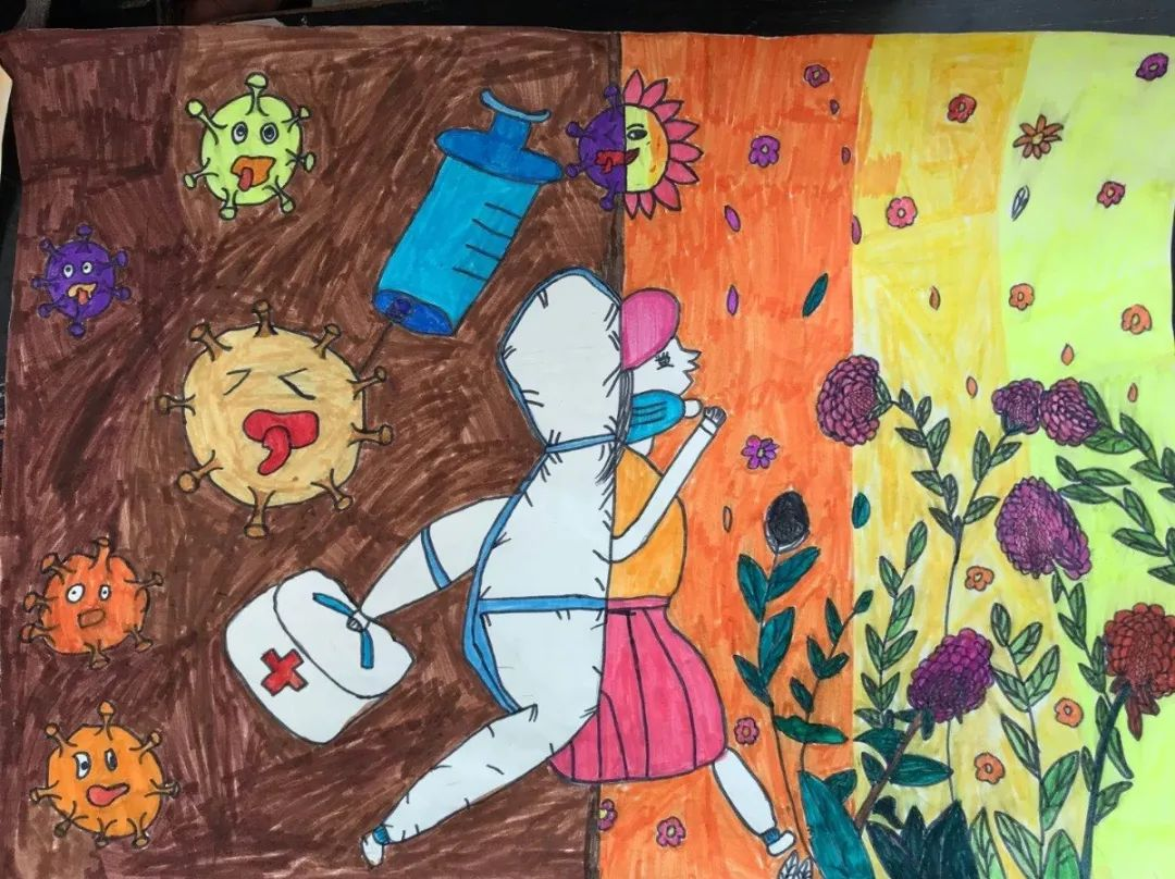 五年级的吴占普和孟广俊同学说:“我们要把童话世界里的勇士(白衣天使)和怪兽(病毒)结合起来进行创作,我们要消灭怪兽!”