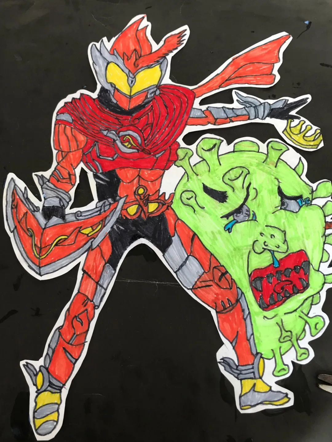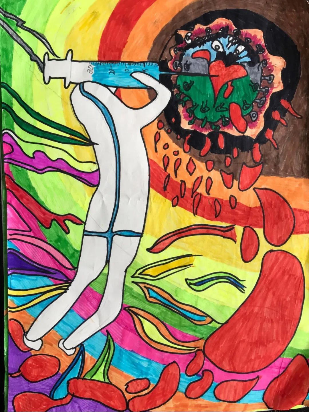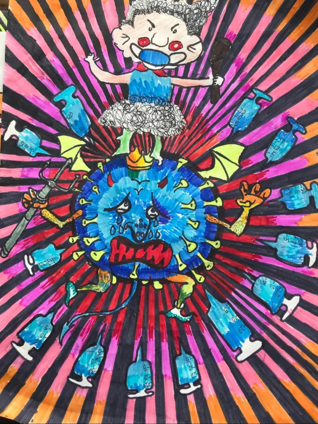 五年级的吴占普和孟广俊同学说:“我们要把童话世界里的勇士(白衣天使)和怪兽(病毒)结合起来进行创作,我们要消灭怪兽!”