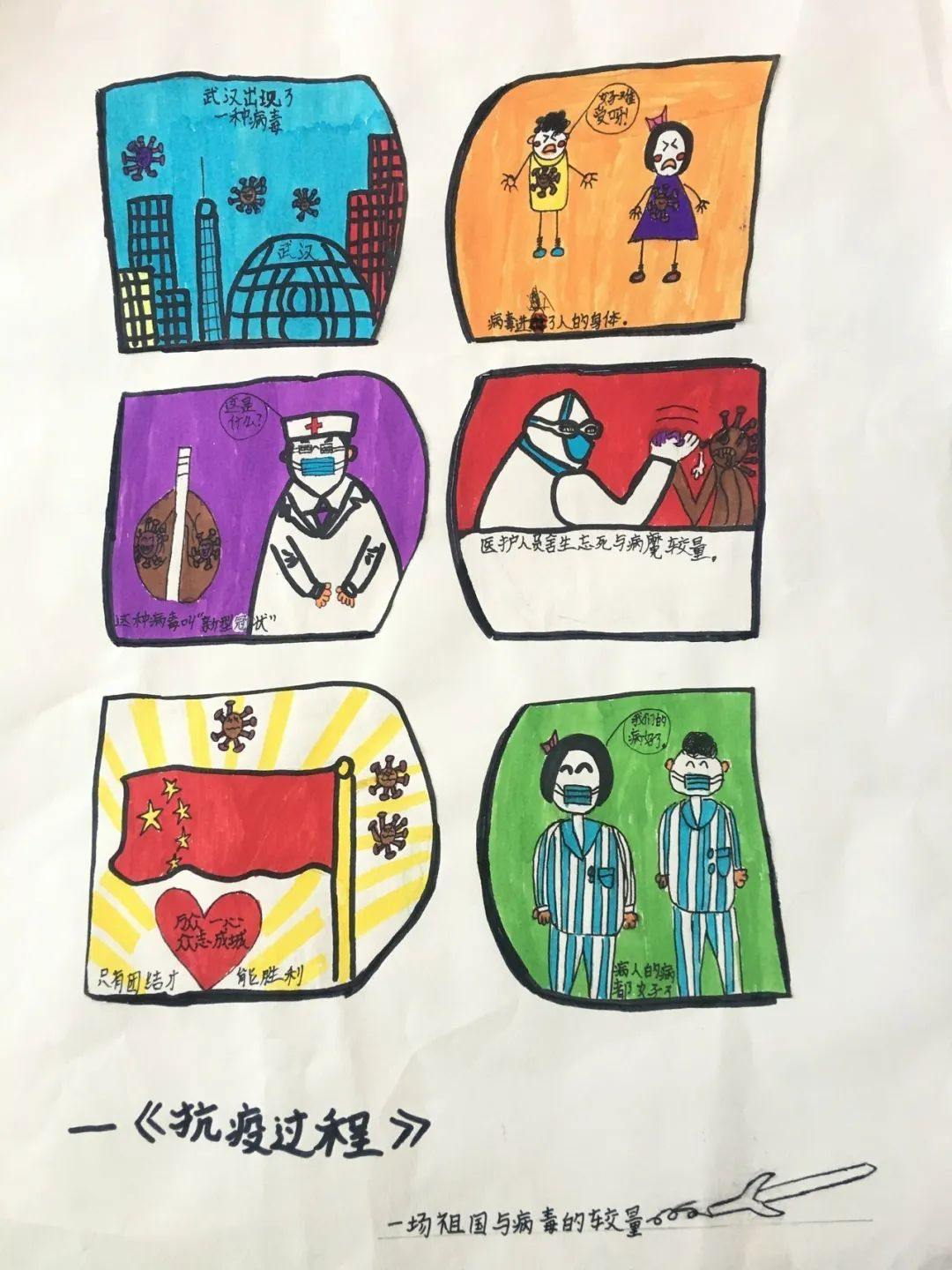 “我想把这次抗疫画成一段故事,故事从武汉说起……这是一场祖国与病毒的较量!”四年级学生孟昭爽。