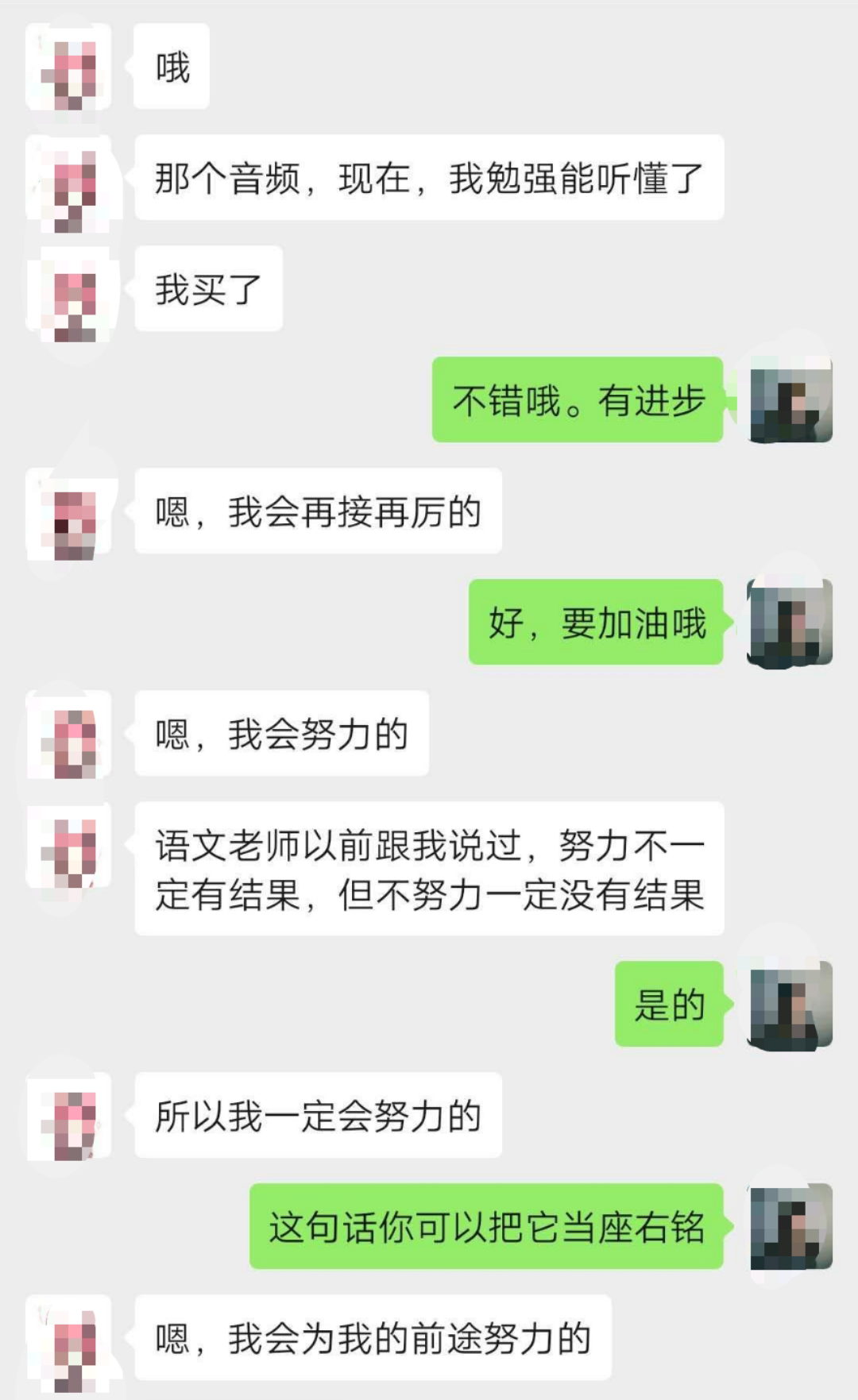 003号四合小学的吴同学非常勤奋,日常有不懂的地方都会及时和英语资教教师成娇老师沟通。这个假期,她还用自己的压岁钱买了新的习题册来学习。“成老师,我想好好学习,努力实现梦想。”