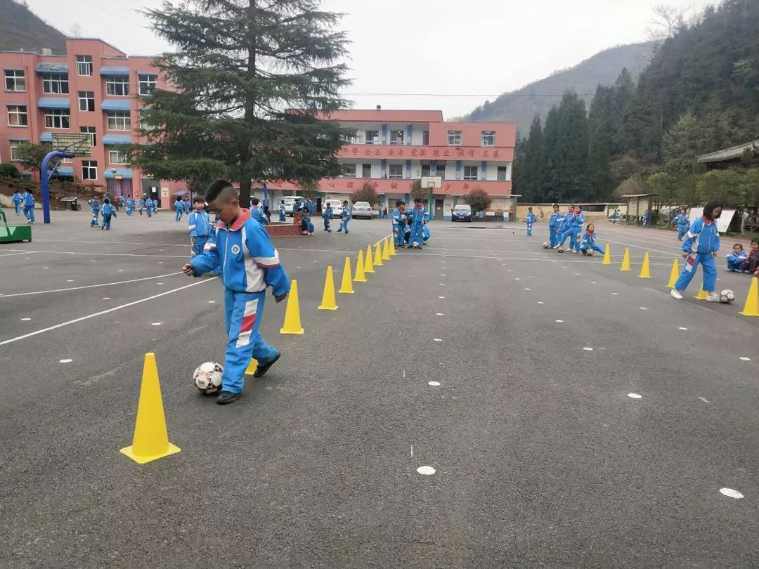 ▲ 黑塘承玲学校(027号资教学校)足球兴趣小组的孩子们在进行带球绕桩练习,指导教师肖吉红。