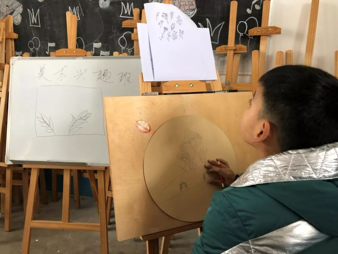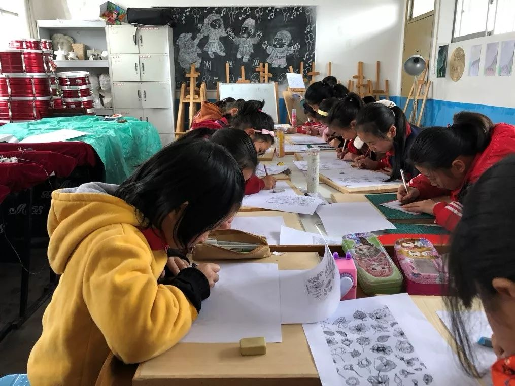 ▲ 簸箩小学(033号资教学校)美术兴趣小组的课堂,孩子们这节课的任务是线描花卉,指导教师陈敏。