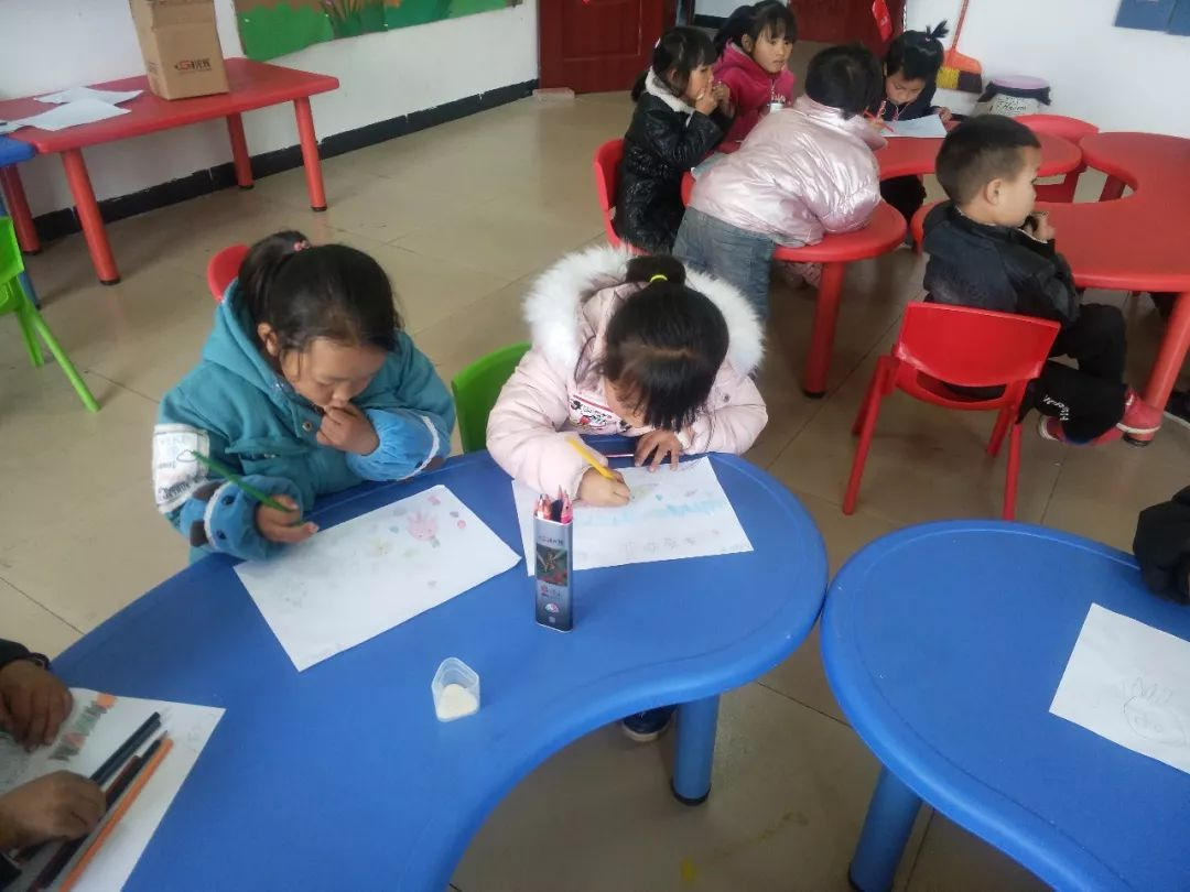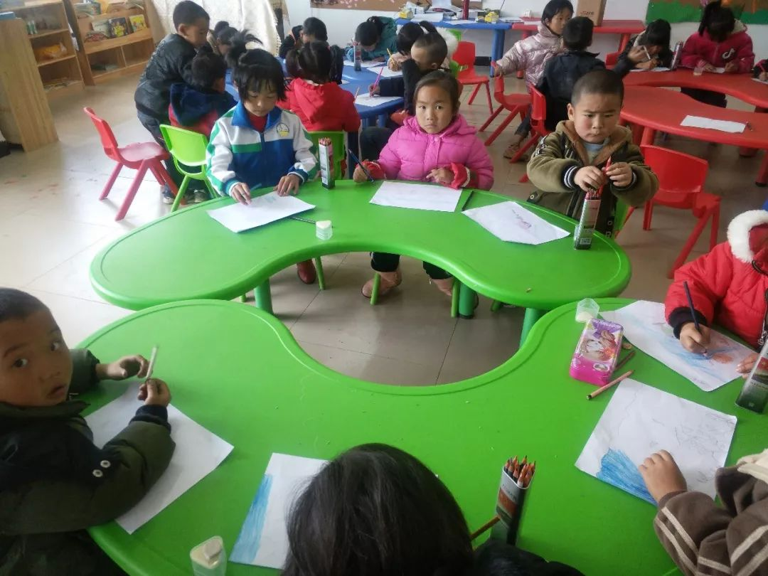 ▲ 龙头幼儿园(034号资教学校)的孩子们在资教教师汤川燕的指导下绘制他们心中的《海底世界》。