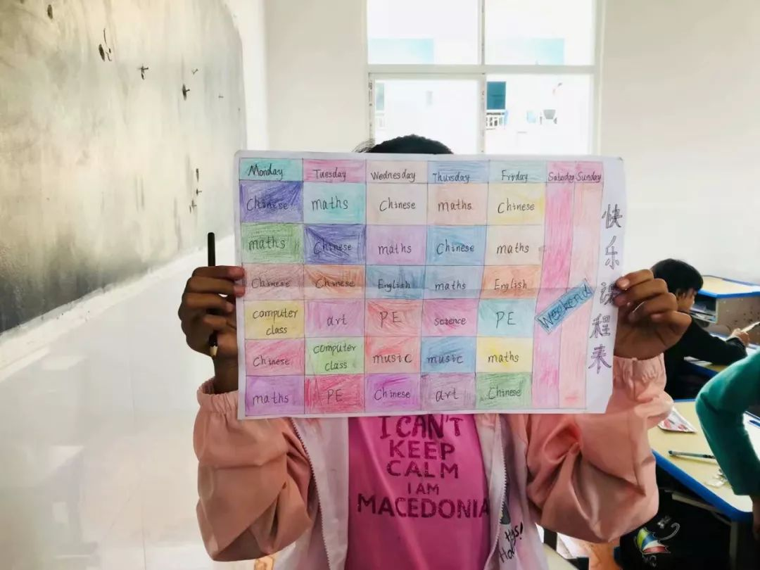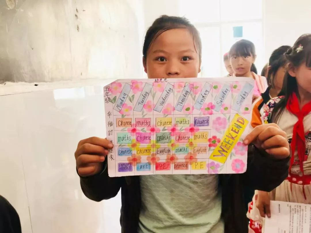 ▲ 贵州省晴隆县兵务小学(022号资教小学)的孩子们制作的英文课程表,指导教师胡静。