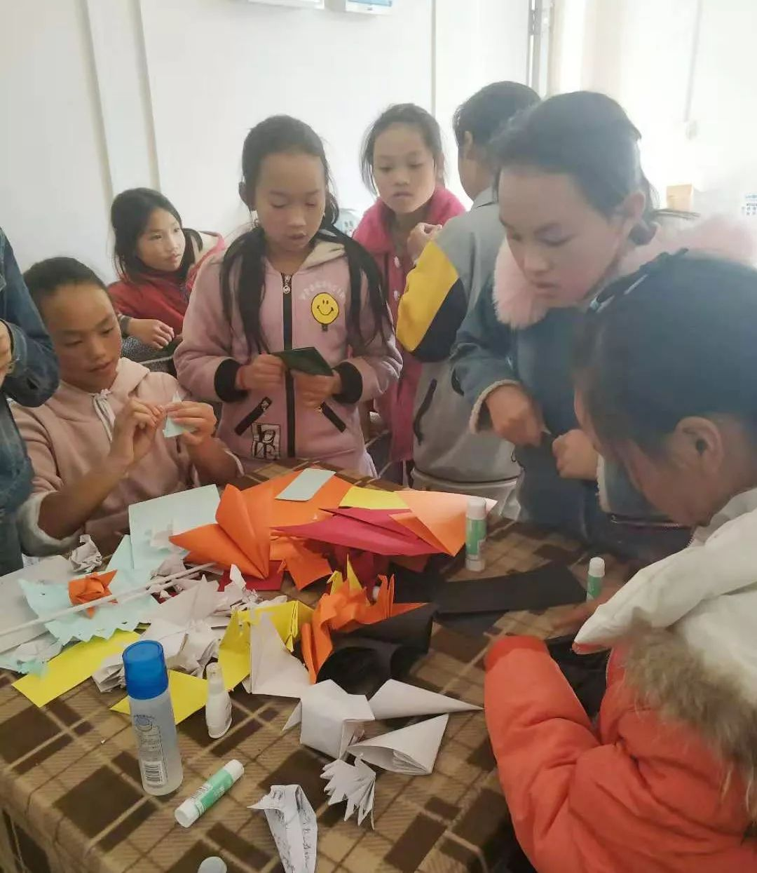 ▲ 贵州省晴隆县红寨小学(024号资教小学)的孩子们在资教教师熊德凤的指导下,学习用彩纸制作手工艺品。