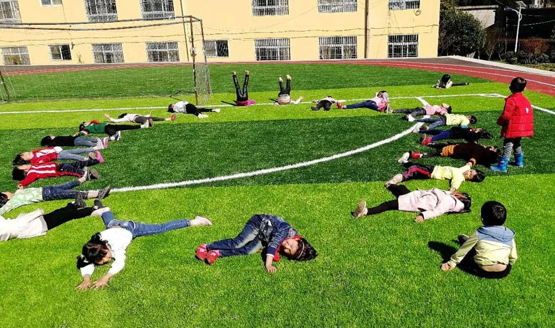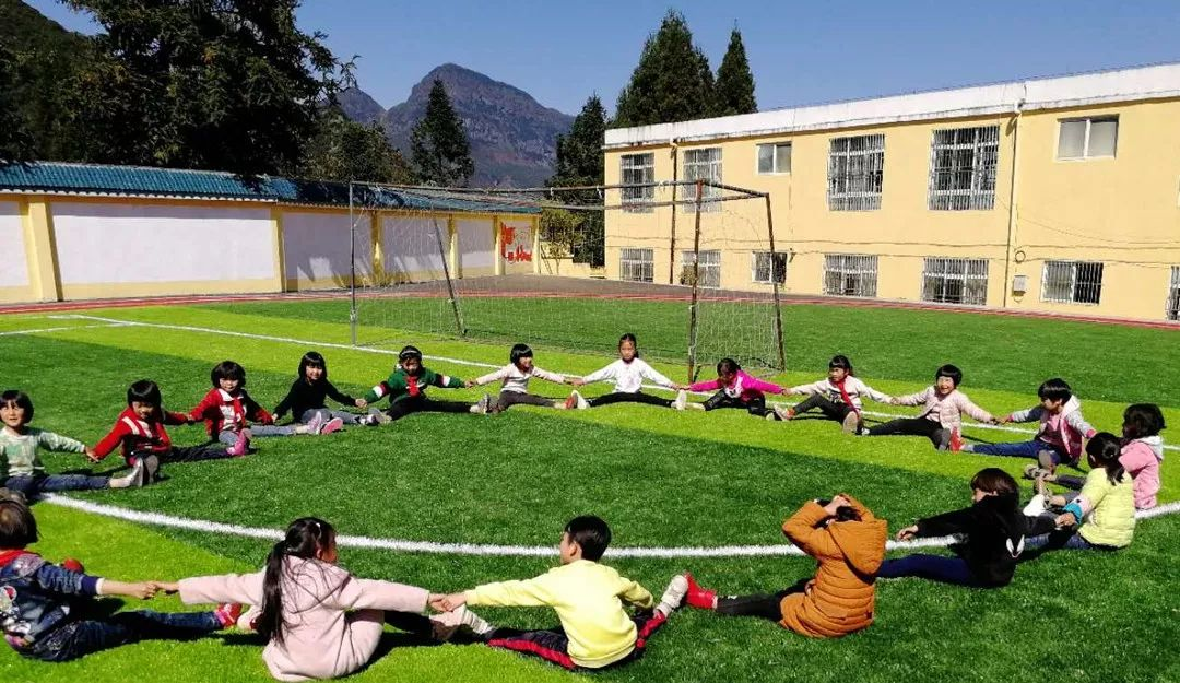 ▲ 贵州省盘州市文阁小学(025号资教小学)的操场上,资教教师王艺珑带领一年级的孩子们做“连圆圈”游戏。