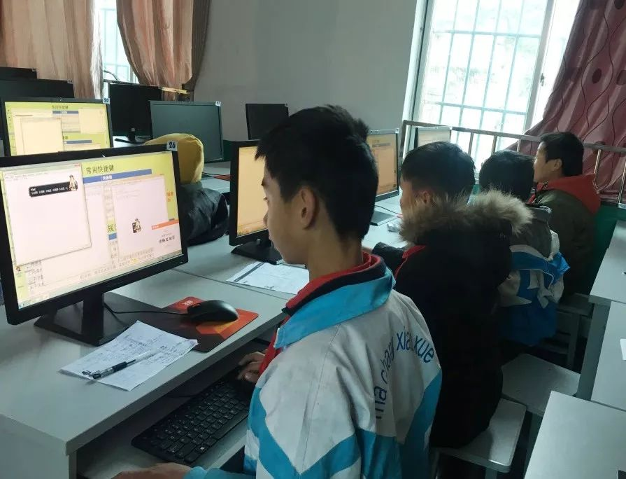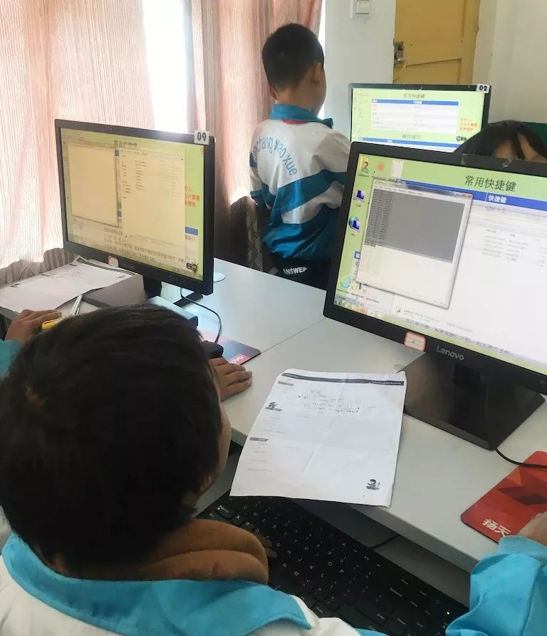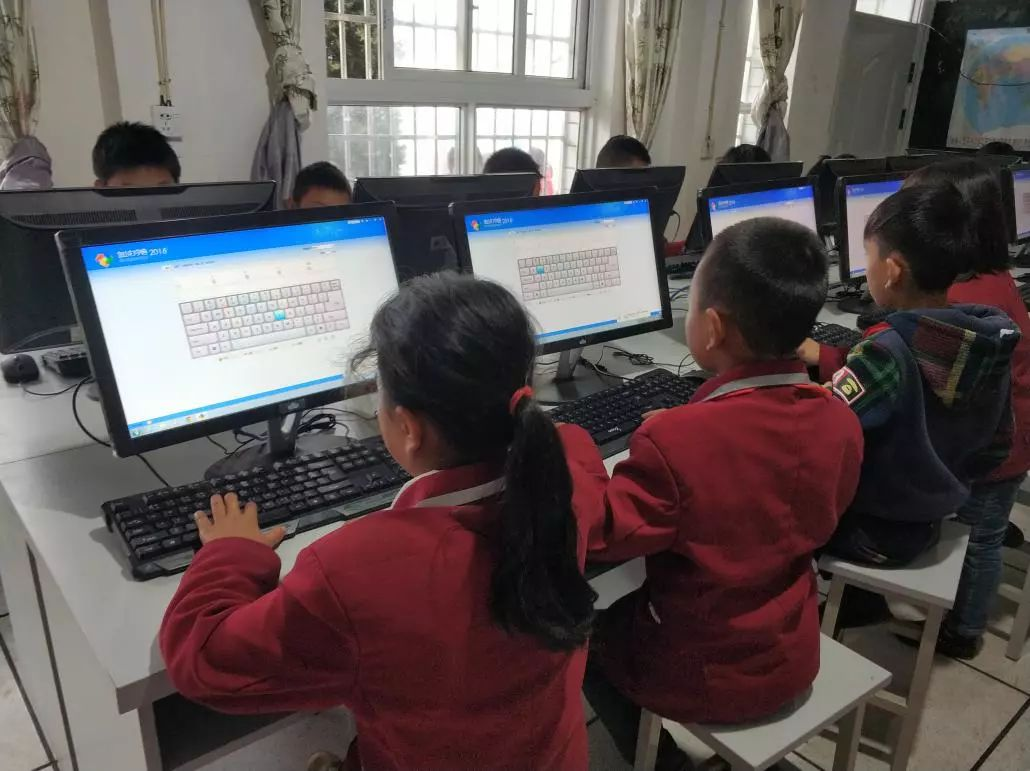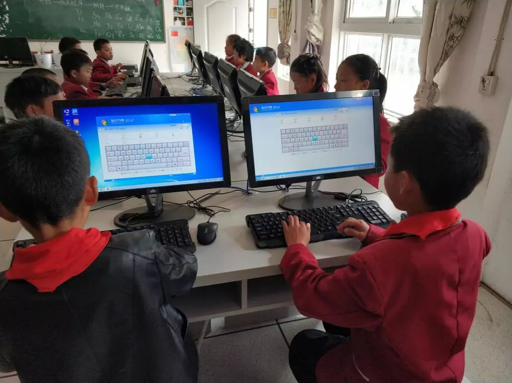 ▲ 贵州省水城县法德小学(028号资教小学)计算机教室内,孩子们在练习拼音打字,指导教师陈梅。