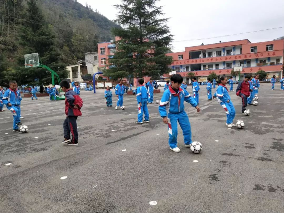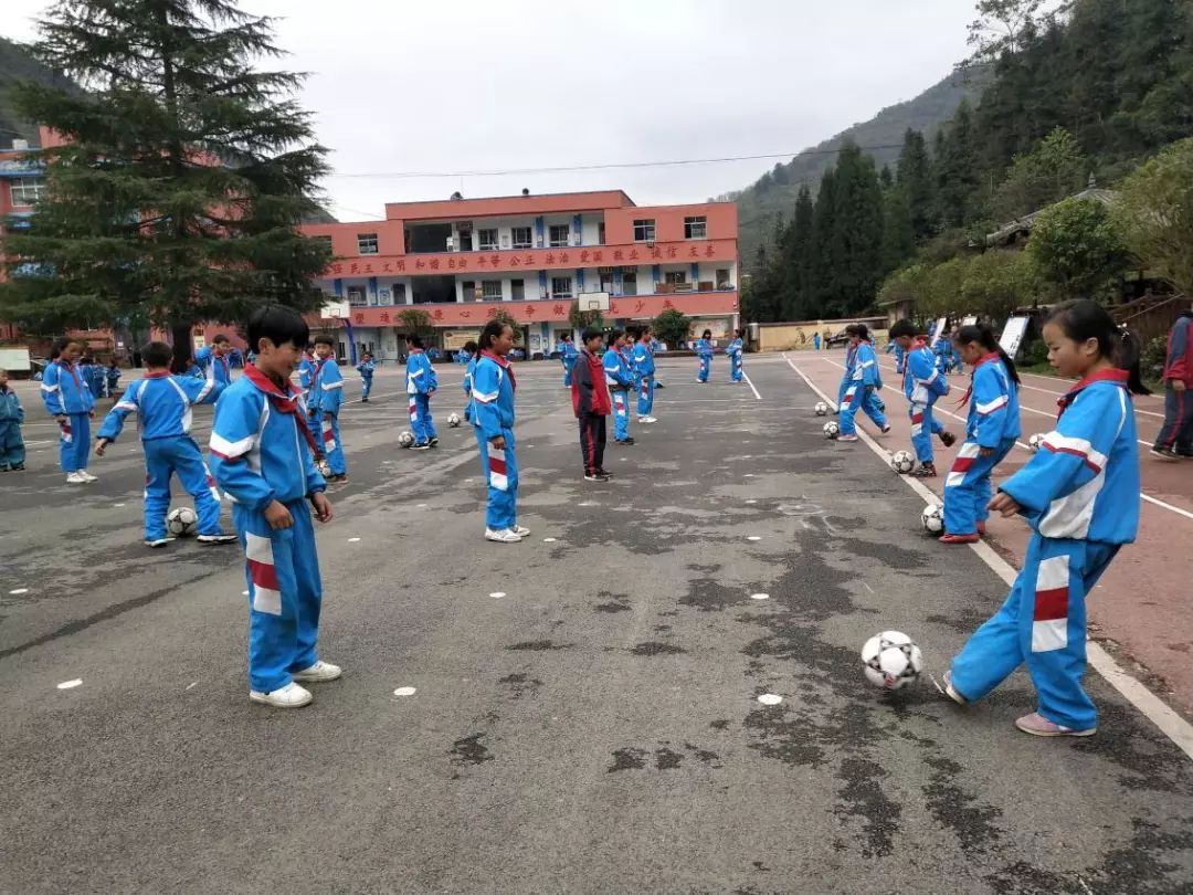 ▲ 贵州省六枝特区黑塘承玲学校(027号资教小学)足球兴趣小组的孩子们在练习脚内侧传接球,指导教师肖吉红。