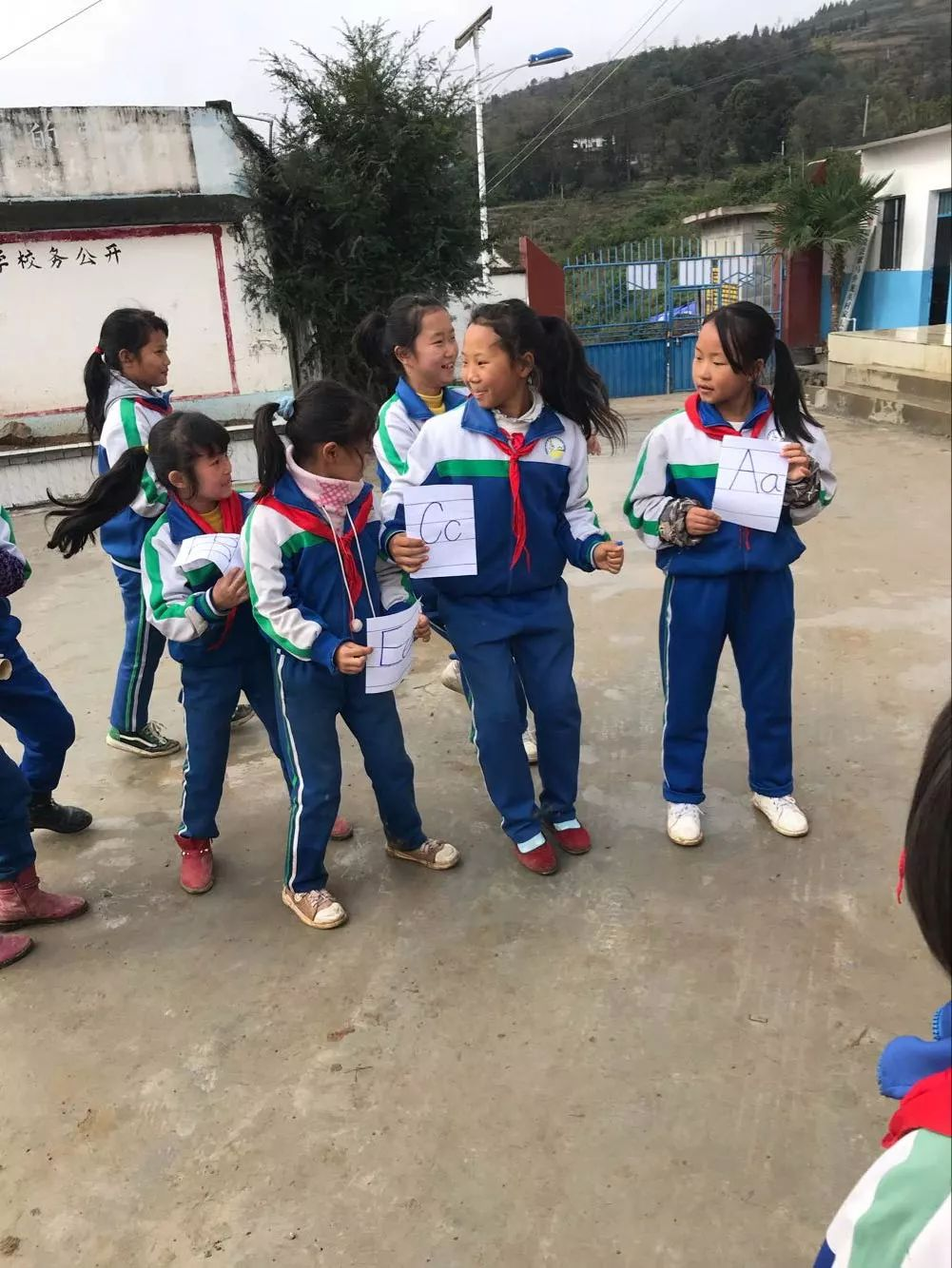 ▲ 贵州省晴隆县龙头小学(002号资教小学)的孩子们在玩英文字母配组游戏,资教教师倪桃把字母Aa-Gg大小写分开,每个孩子领一张卡片,游戏开始时,相同的大小写字母要立刻开始“找朋友”。