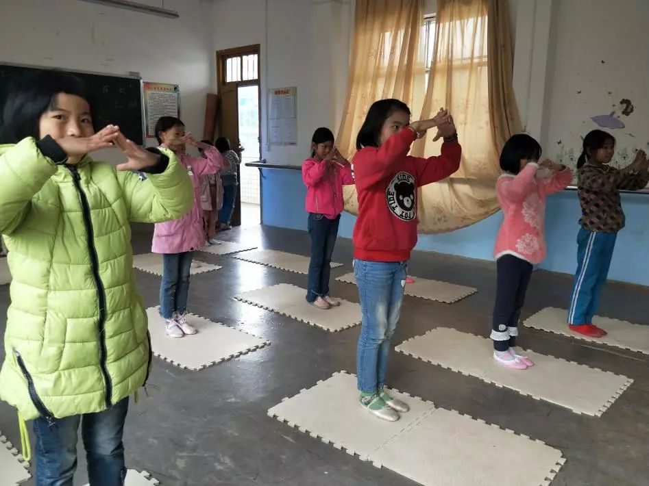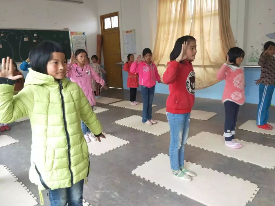 ▲ 贵州省晴隆县四合小学(003号资教小学)的孩子们在练习舞蹈《快乐星猫》,指导教师皮颖。