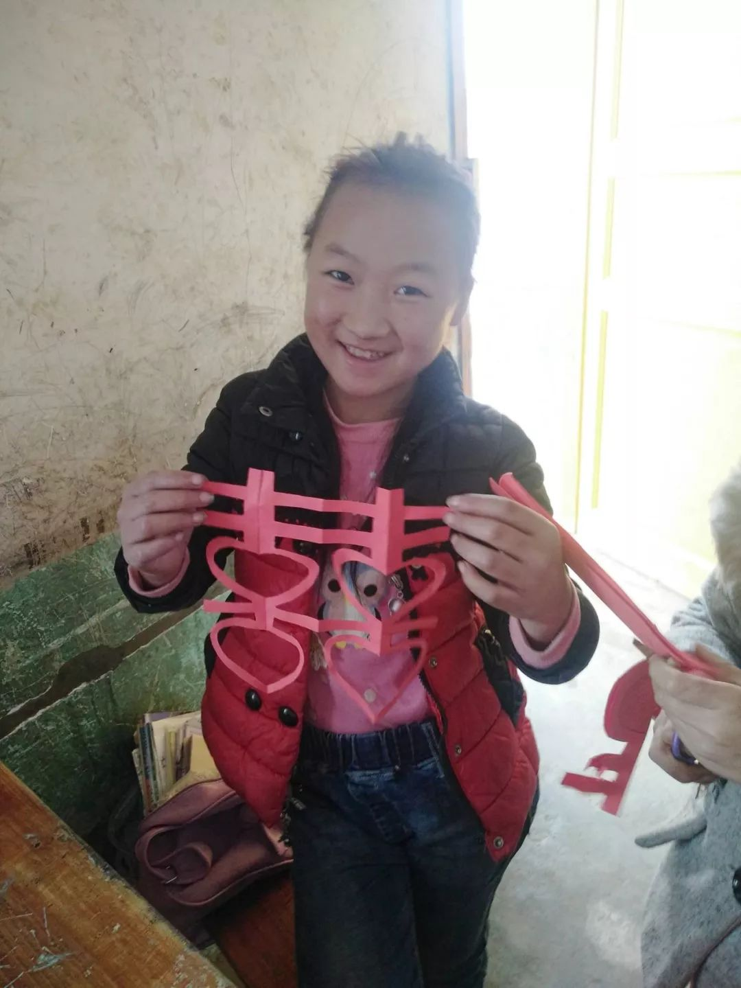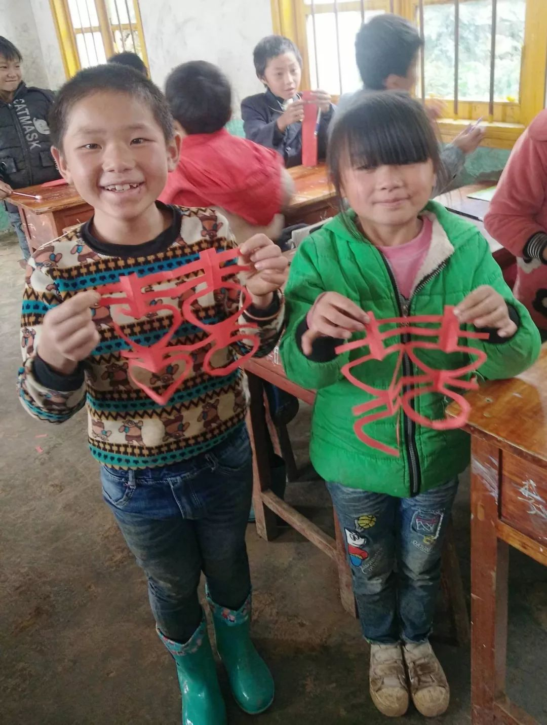 ▲ 贵州省晴隆县兰蛇教学点(004号资教小学)的孩子们制作的喜字剪纸,指导教师陈小龙。