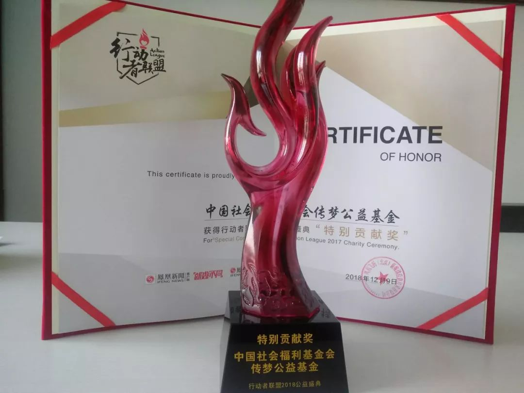 2018年12月9日,由凤凰网主办,凤凰网公益承办的“行动者联盟2018公益盛典”在北京举行。传梦公益基“资教工程”项目获得“行动者联盟2018公益盛典”特别贡献奖(机构类)。