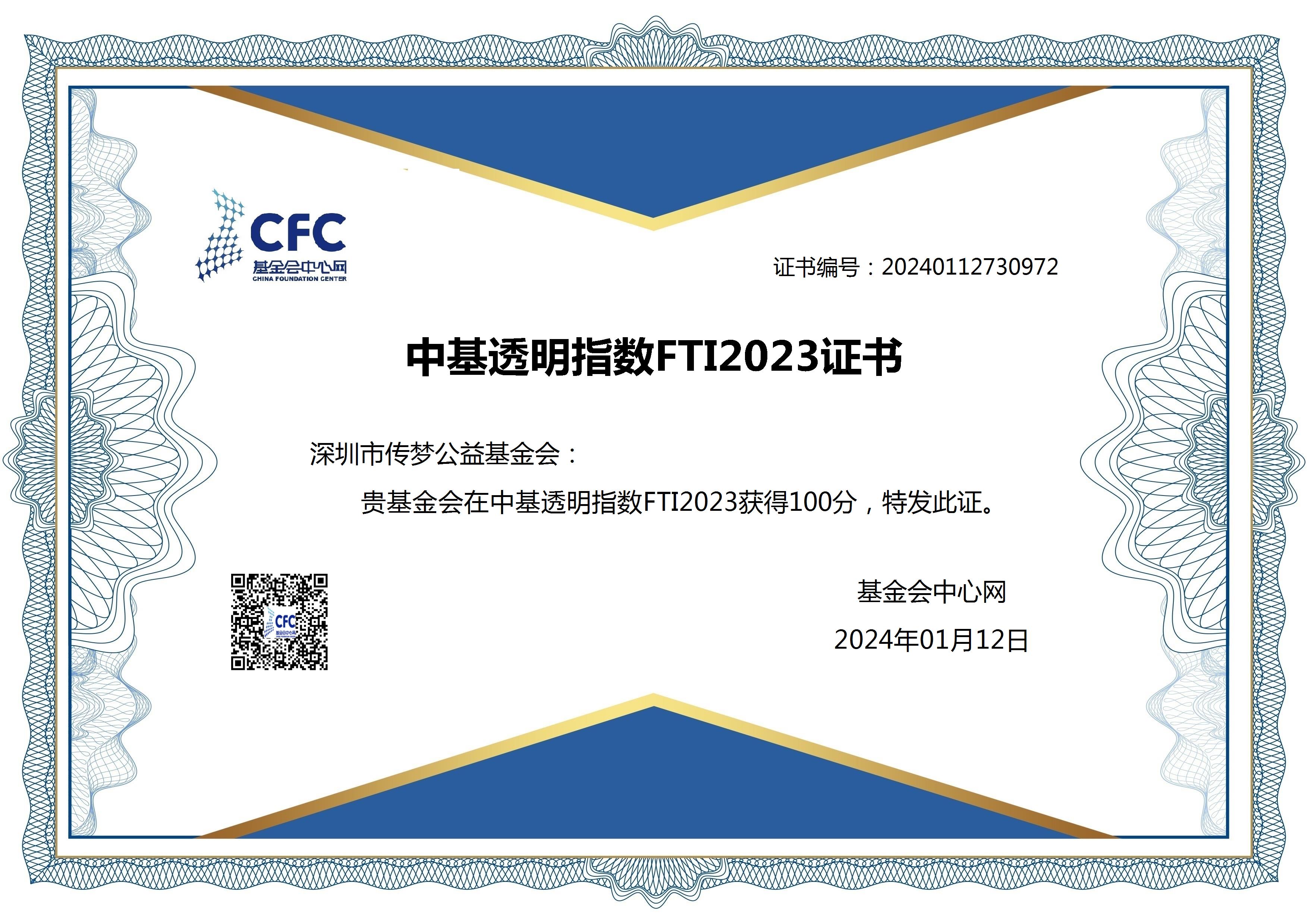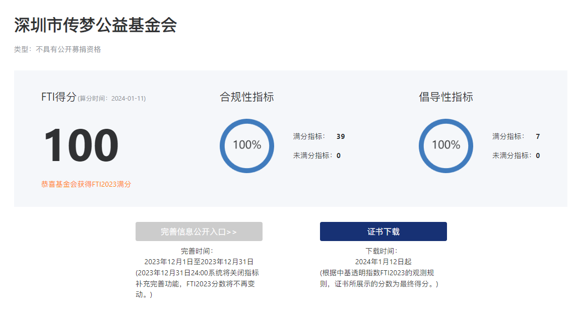 2024年1月12日,中基透明指数FTI2023透明度榜单在北京发布,深圳市传梦公益基金会FTI2023以满分100分的成绩上榜。