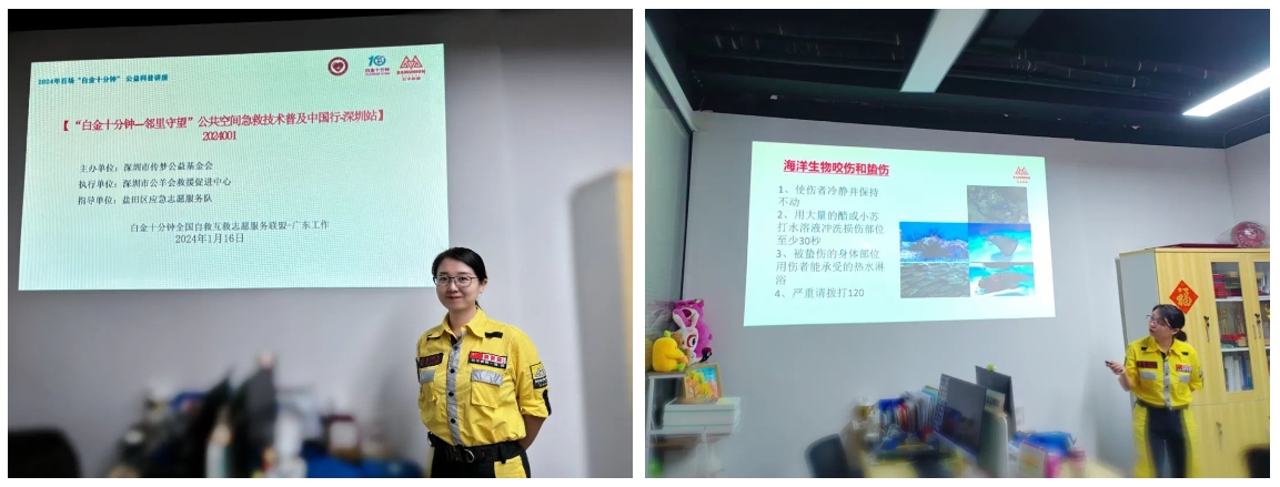 本次培训活动邀请国家应急救援员、深圳市公羊会救援促进中心救援队队员、白金十分钟公益急救科普宣讲师苏晨,以知识理论和实践演练相结合的方式,为义工们细致讲解应急救护知识。