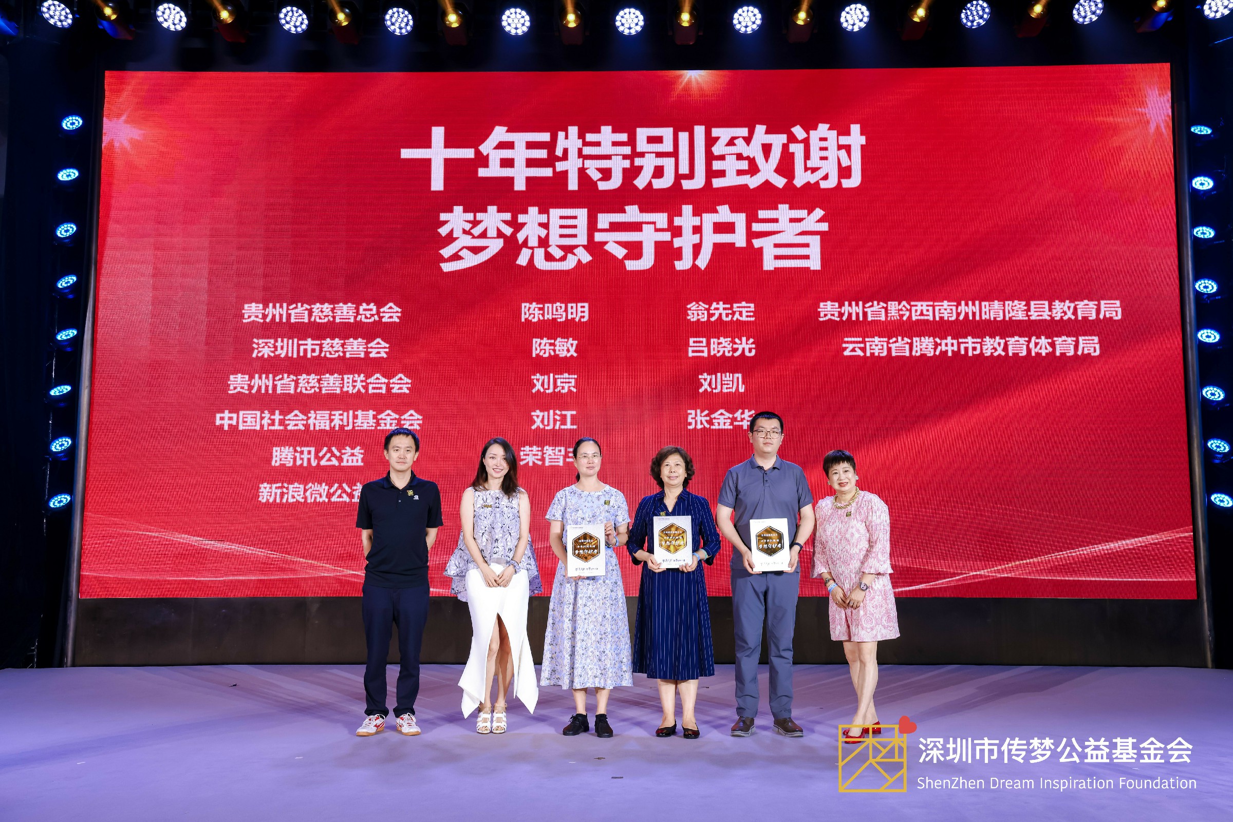 盛典现场致谢了十年来社会各界的爱心支持,发布了“十年特别致谢·梦想守护者”“最佳公益伙伴”“荣誉传梦大使”“传梦卓越助力官”“传梦公益新星”“荣誉资教教师”“致敬爱心伙伴”7项致谢名单,陈鸣明、陈敏、马蔚华、深圳市传梦公益基金会名誉理事荣智丰、常务理事黄勇、燕信伶为获奖代表颁发荣誉奖牌。
