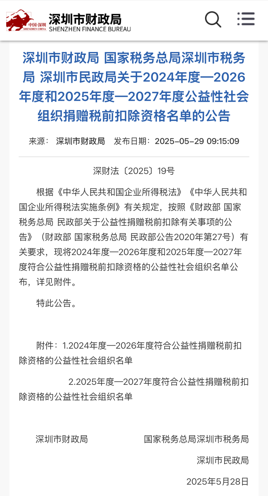 根据《中华人民共和国企业所得税法》、《中华人民共和国企业所得税法实施条例》有关规定,按照《财政部 国家税务总局 民政部关于公益性捐赠税前扣除有关事项的公告》(财政部 国家税务总局 民政部公告2020年第27号)有关要求,深圳市财政局、国家税务总局深圳市税务局、深圳市民政局,联合发布了2025年度—2027年度公益性社会组织捐赠税前扣除资格名单的公告。