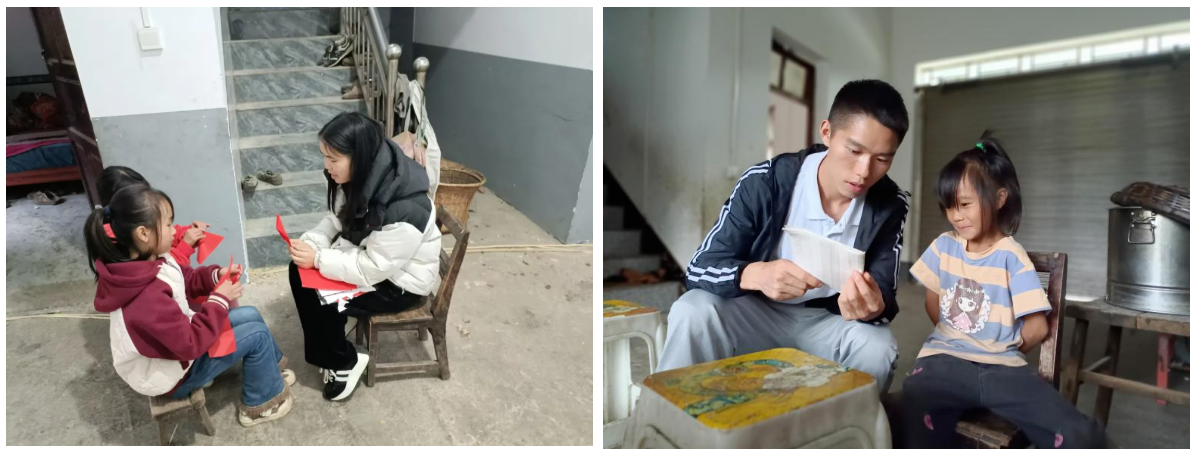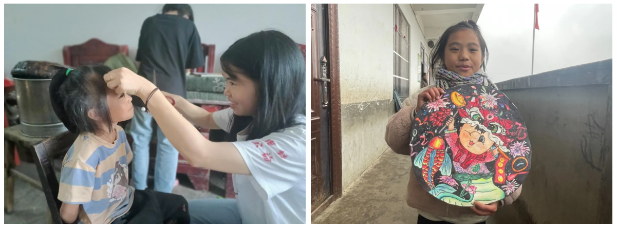 2022年9月,资教教师郭尹和陆慧两位老师第一次去家访,那时的王子琴还有些羞涩地躲在门后,不好意思跟老师说话。之后两位老师便常常与她一同回家:郭老师会常常教她帮爷爷奶奶做家务、教她运动小技巧,陆老师会贴心帮她剪刘海、教她刺绣和画画、鼓励她加入兴趣小组找到自己的兴趣爱好。在资教教师们日复一日地陪伴和引导下,王子琴慢慢发生着改变。